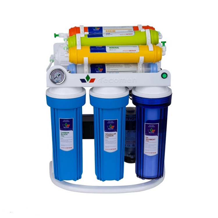 دستگاه تصفیه آب خانگی تکومن با 8 مرحله فیلتراسیون کامل، دستگاهی با قطعات ویتنامی کیفیت بالا میباشد. ترتیب فیلتراسیون تصفیه آب تکومن شامل: مرحله اول فیلتر الیافی (pp) از جنس پلی پروپیلن است. ذرات بزرگتر از 5 میکرون را فیلتر میکند. در نتیجه شن، ماسه، زنگ آب، جلبک، گل و لای از آب حذف میشوند. مرحله دوم (کربن اکتیو) و مرحله سوم (کربن بلاک) کلر، تری هالومتانها، هالو استیک اسیدها، مواد شیمیایی، آفتکشها و حشرهکشها را جذب میکنند. در نتیجه طعم و بوی آب را بهبود میبخشند. فیلتر چهارم (محافظ ممبران) یک فیلتر الیافی 1 میکرون است. اجازه عبور ذرات بزرگتر از 1 میکرون را نمیدهد. در نتیجه باعث افزایش عمر فیلتر ممبران میشود. مرحله پنجم (فیلتر ممبران) اصلیترین فیلتر دستگاه تصفیه آب است. این فیلتر به رو اسمز معکوس اجازه عبور بزرگتر از 0.1 نانومتر را نمیدهد. در نتیجه فلزات سنگین مانند جیوه، آرسنیک، سرب، میکروارگانیسمها شامل ویروس و باکتری و آلایندههای فیزیکی و شیمیایی را حذف میکند. مرحله ششم (فیلتر قلیایی) باعث قلیایی شدن آب آشامیدنی میشود. طبق تحقیقات انجام گرفته آب قلیایی تأثیر مثبتی بر سلامتی فرد دارد. مرحله هفتم (فیلتر پست کربن) طعم و بوی آب را بهبود میدهد. مرحله هشتم (فیلتر مینرال) با اضافه کردن مواد معدنی، هم در تأمین مواد معدنی مورد نیاز بدن تأثیر دارد و هم باعث بهبود طعم آب میشود. علاوه بر 8 مرحله فیلتراسیون، دستگاه دارای قطعات زیر میباشد: پمپ با قدرت 125 psi تایوانی دارد. دارای دکمه پاور جهت روشن و خاموش کردن دستگاه مخزن 19 لیتری تانک لایف وارداتی فود گرید 3 لایه دارد. اتصالات و هوزینگهای فود گرید محصول شرکتی تکومن دارد. بدنه فلزی ضد زنگ دارد. شیر اهرمی سنگین دارد. پک فیلتر پیش تصفیه اضافی دارد. پک اتصالات نصب به صورت کامل به همراه شلنگ دارد.